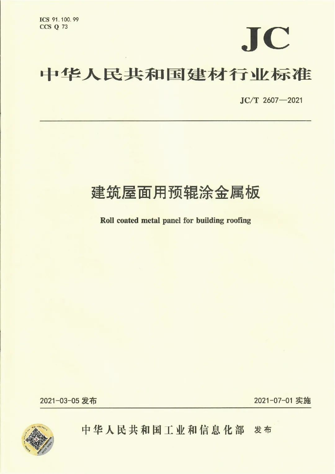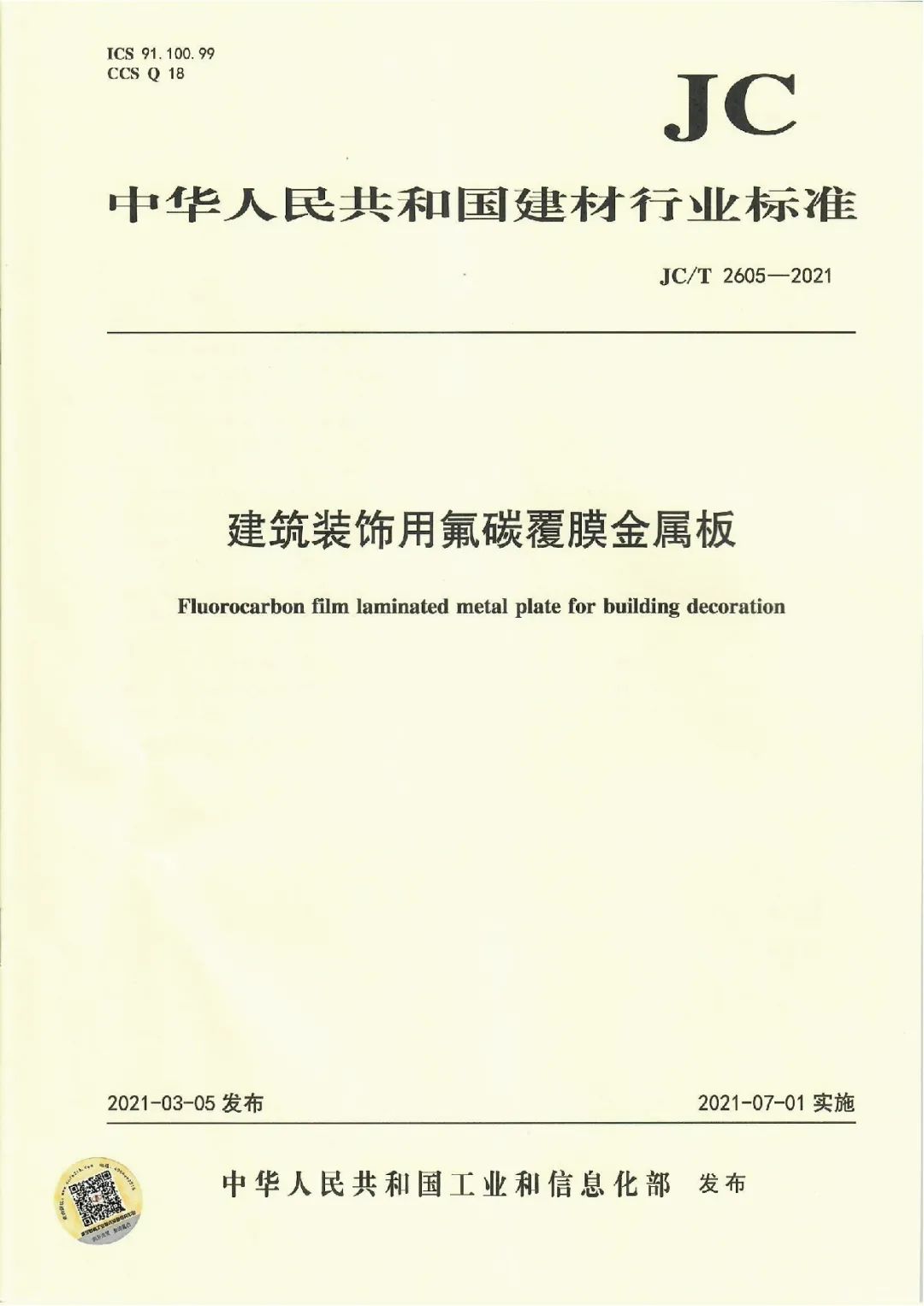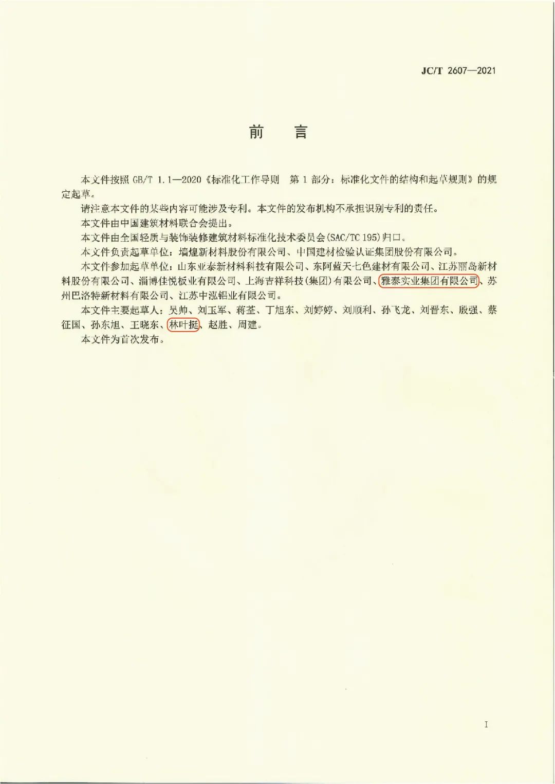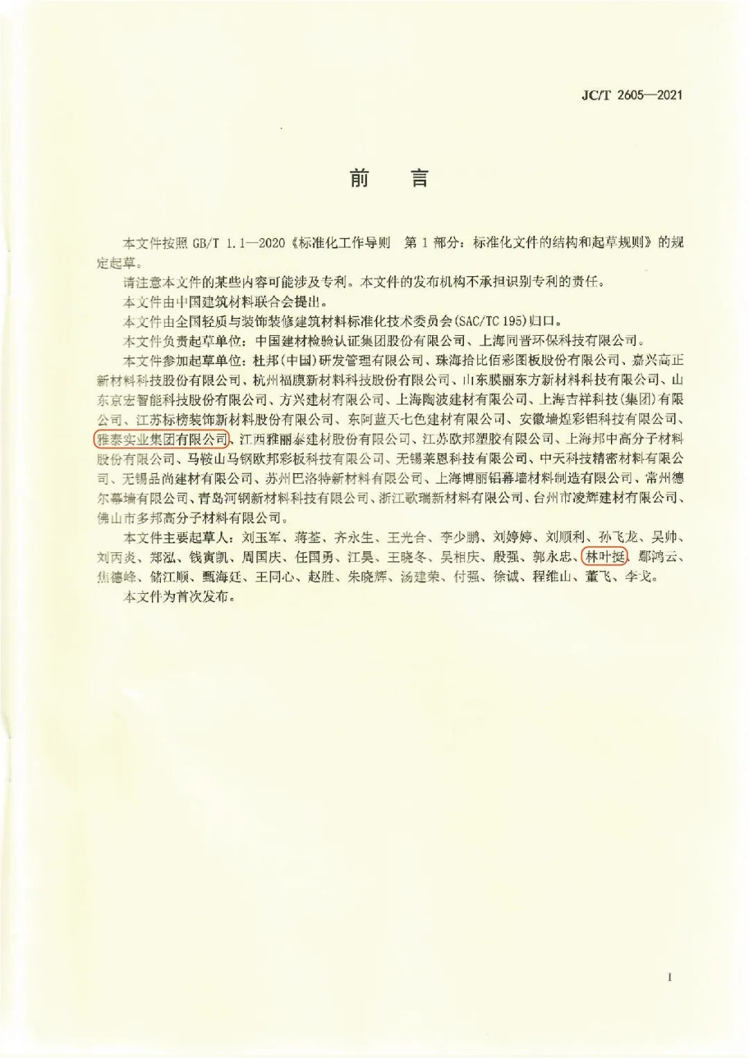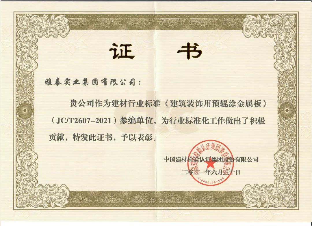 近日,由中國建筑材料聯(lián)合會提出,雅泰實業(yè)集團參與起草的《JC/T2605-2021建筑裝飾用氟碳覆膜金屬板》、《JC/T2607-2021建筑屋面用預輥涂金屬板》兩項行業(yè)標準于2021年3月5日發(fā)布,同年7月1日正式實施,公司技術(shù)部經(jīng)理林葉挺為此次兩項行業(yè)標準的主要起草人之一。