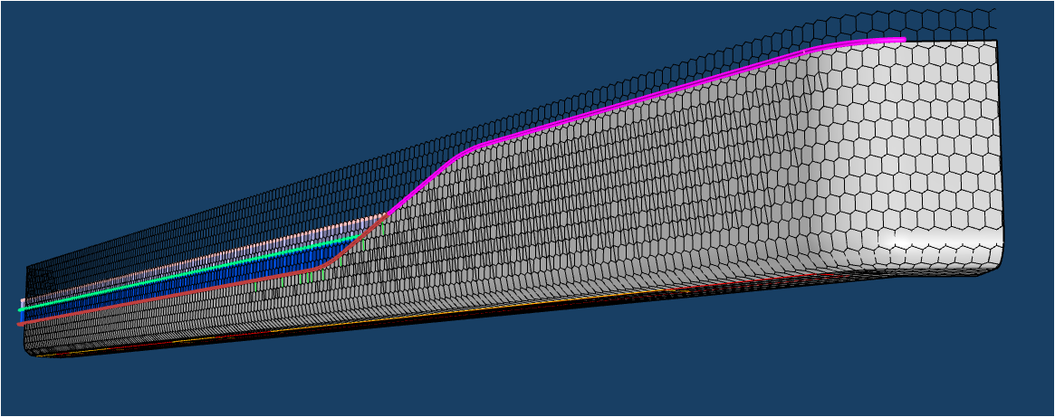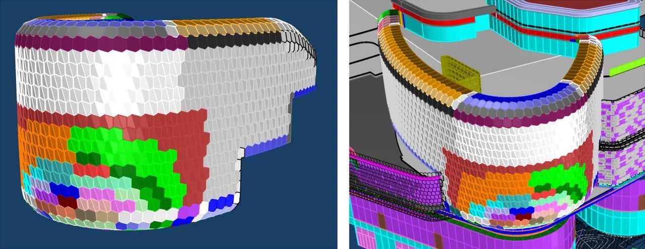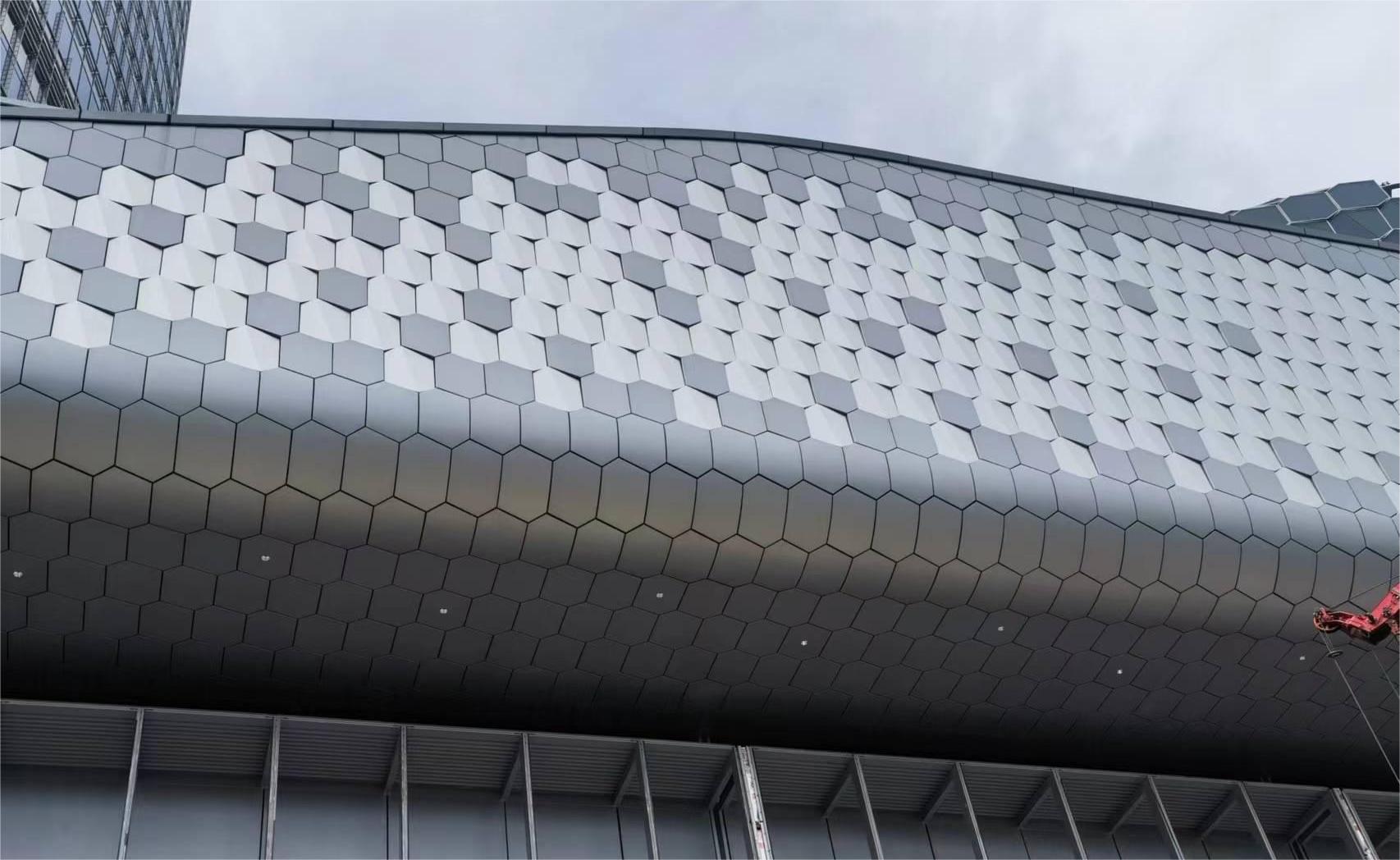 南裙樓船頭造型內(nèi)部鋼結(jié)構(gòu)均有扭轉(zhuǎn),要求拐角幕墻呈現(xiàn)雙曲面效果;屋檐幕墻設計圍繞龍鱗造型,分解為單片“六邊形”元素展開,拐角弧度造型對鋁板制造及安裝工藝要求極高。