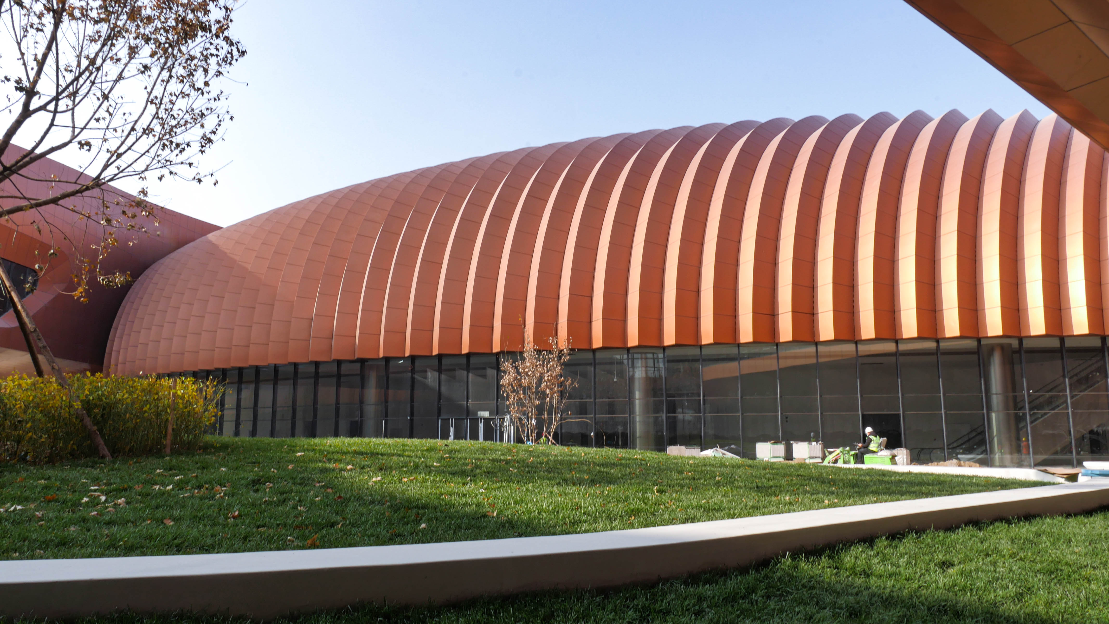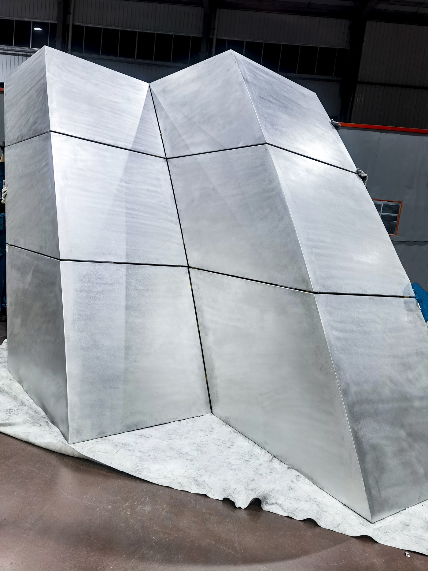 北京新國展“紫金絲帶”褶皺板,每件板上下、左右角度都有區(qū)別變化,左右呈發(fā)散式布局安裝,上下角度變化2.5度。尺寸偏差不超±1毫米,角度偏差不超過±0.5度,每件板都需專用模標(biāo)尺測量弧度。